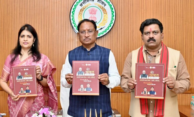 रायपुर। मुख्यमंत्री विष्णु देव साय ने आज विधानसभा स्थित अपने कार्यालय कक्ष में प्रधानमंत्री आवास योजना (ग्रामीण) के अंतर्गत अपनी प्रथम मंत्रिपरिषद बैठक में 18 लाख आवास स्वीकृत किए जाने के निर्णय के दो वर्ष पूर्ण होने के अवसर पर एक आकर्षक कॉफी टेबल बुक का अनावरण किया। यह पुस्तक राज्य में ग्रामीण आवास योजना के तहत प्राप्त ऐतिहासिक प्रगति, नवाचारों और उपलब्धियों को प्रभावी रूप से प्रस्तुत करती है।