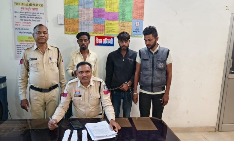 बिलासपुर। वरिष्ठ पुलिस अधीक्षक राजनेश सिंह द्वारा जिला बिलासपुर के समस्त थाना प्रभारियों को शख्त हिदायत देकर सार्वजनिक स्थानों में तलवार चाकू लेकर आम नागरिकों को डराने धमकाने वालों पर कार्यवाही करने का निर्देश दिया गया है उक्त निर्देश के पालन में थाना प्रभारी तारबाहर को जरिए मुखबिर से सूचना प्राप्त हुआ कि पुराना बस स्टैंड बिलासपुर शराब दुकान के पास 03 व्यक्ति लोहे का चाकू लेकर आम जनों को डरा रहा है। उक्त सूचना से वरिष्ठ अधिकारियों को अवगत कराते हुए तत्काल मय हमराह स्टाफ के घटना स्थल पहुंच कर तीनों व्यक्ति को अभिरक्षा में लेकर नाम पता पूछने पर अपना अपना नाम अजय गंगवानी, ईश्वर साहू, सोंटी उर्फ ऋषभ तिवारी तीनों बिलासपुर शहर के रहने वाले होना बताये तीनों के कब्जे से एक एक लोहे का चाकू जप्त कर तीनों के विरुद्ध आर्म्स एक्ट की धारा 25, 27 के तहत कार्यवाही कर माननीय न्यायालय के समक्ष पेश किया गया है।